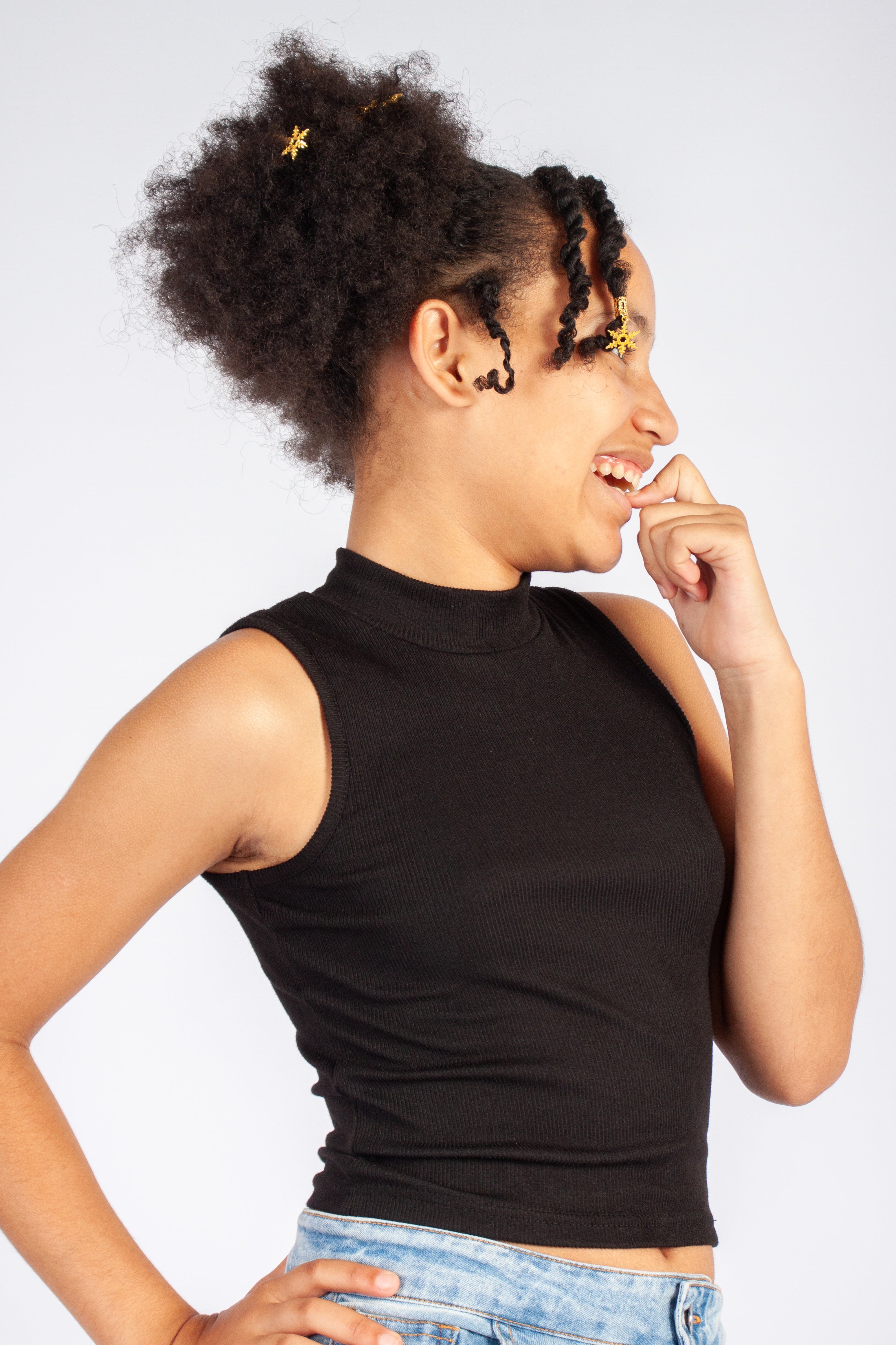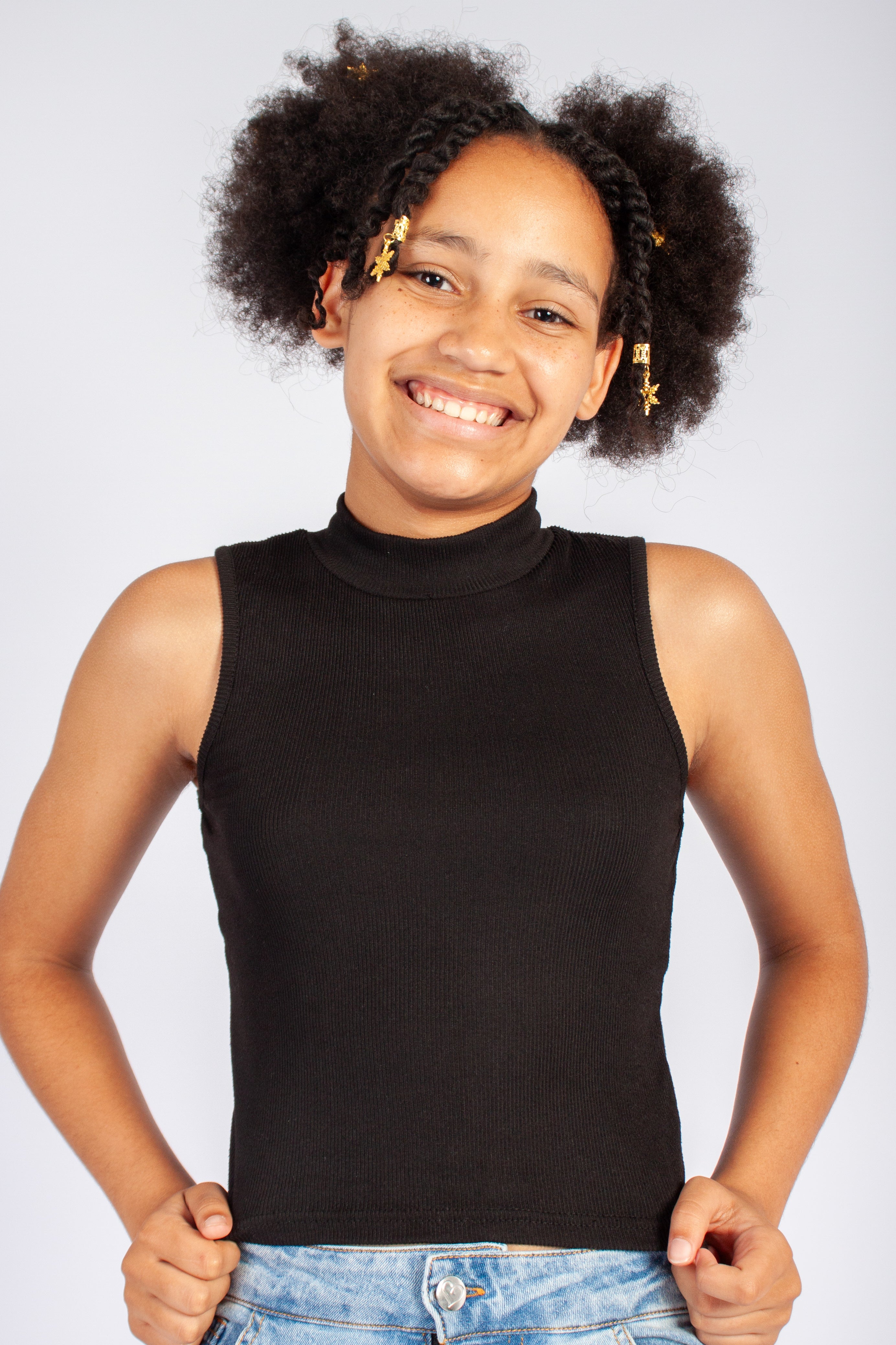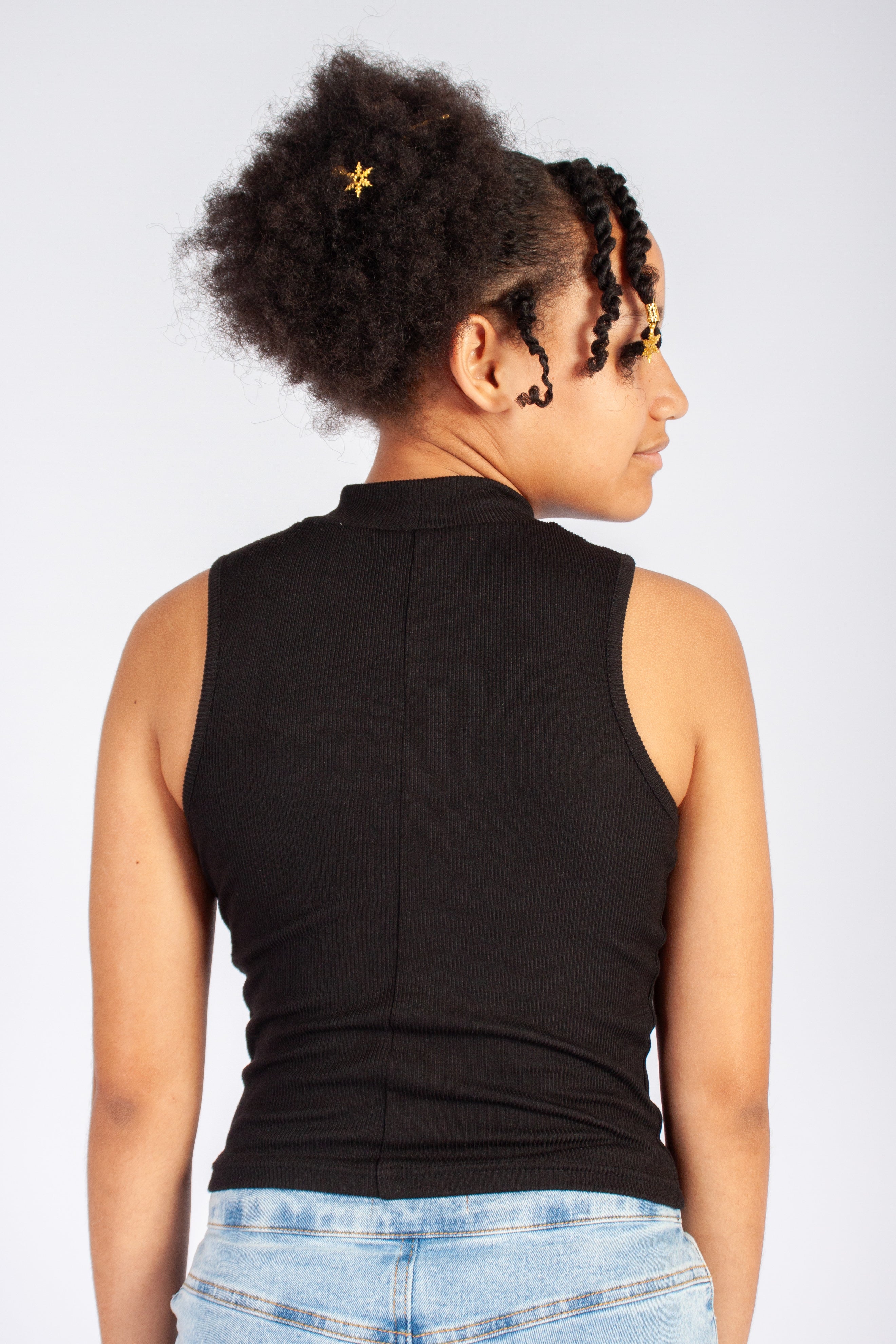 This turtle neck ribbed vest has a high neckline. Sleeveless with a regular length.