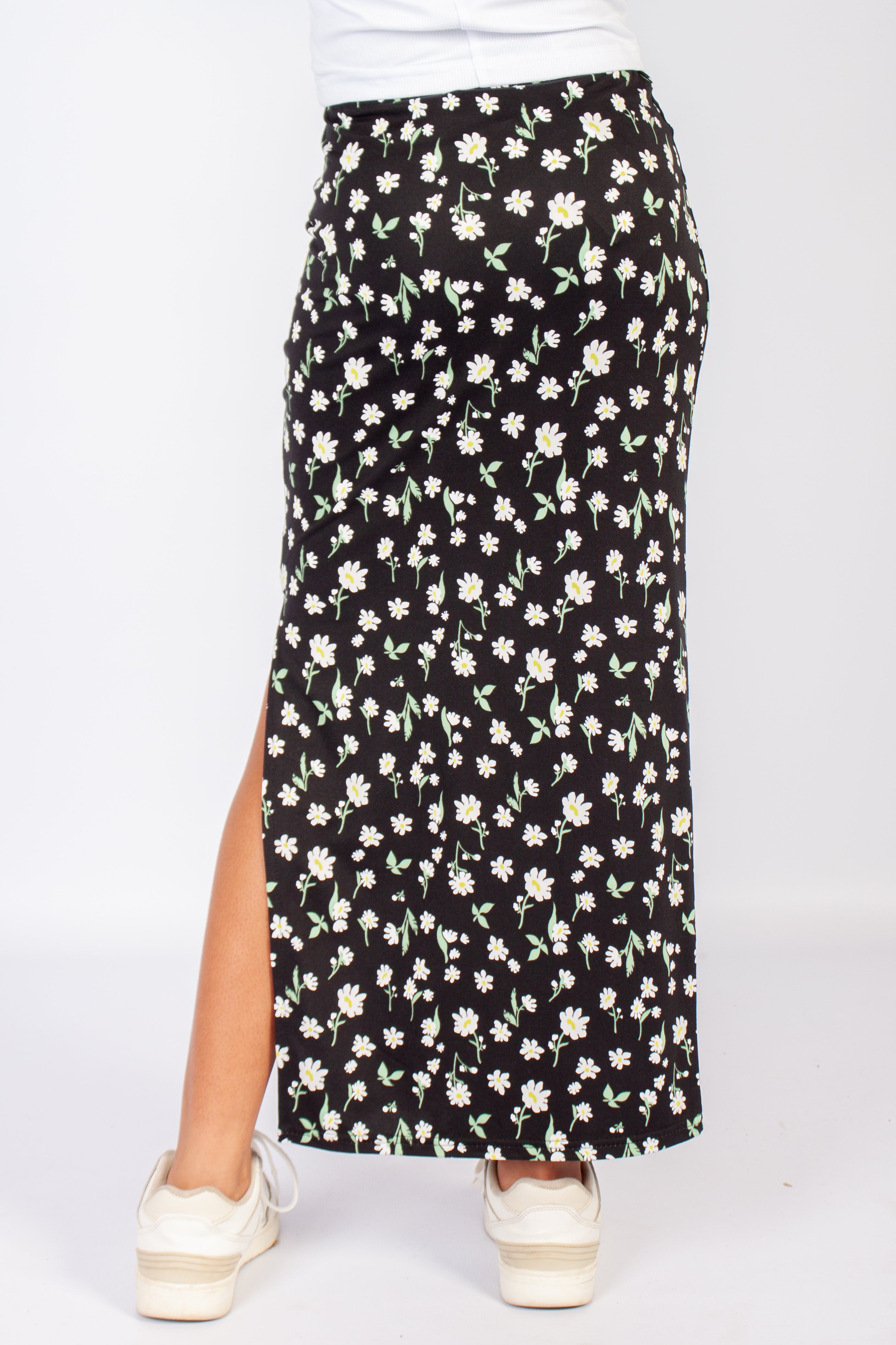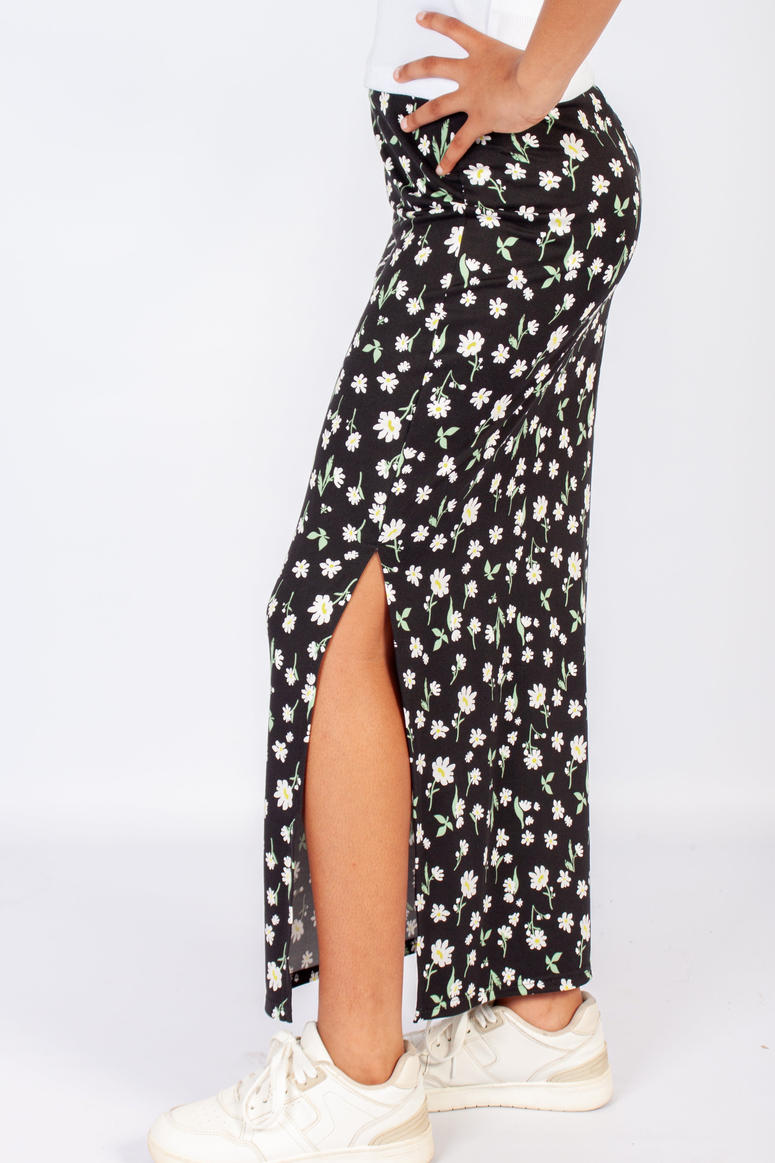 High rise waistband with a side slit detail. Maxi length.
