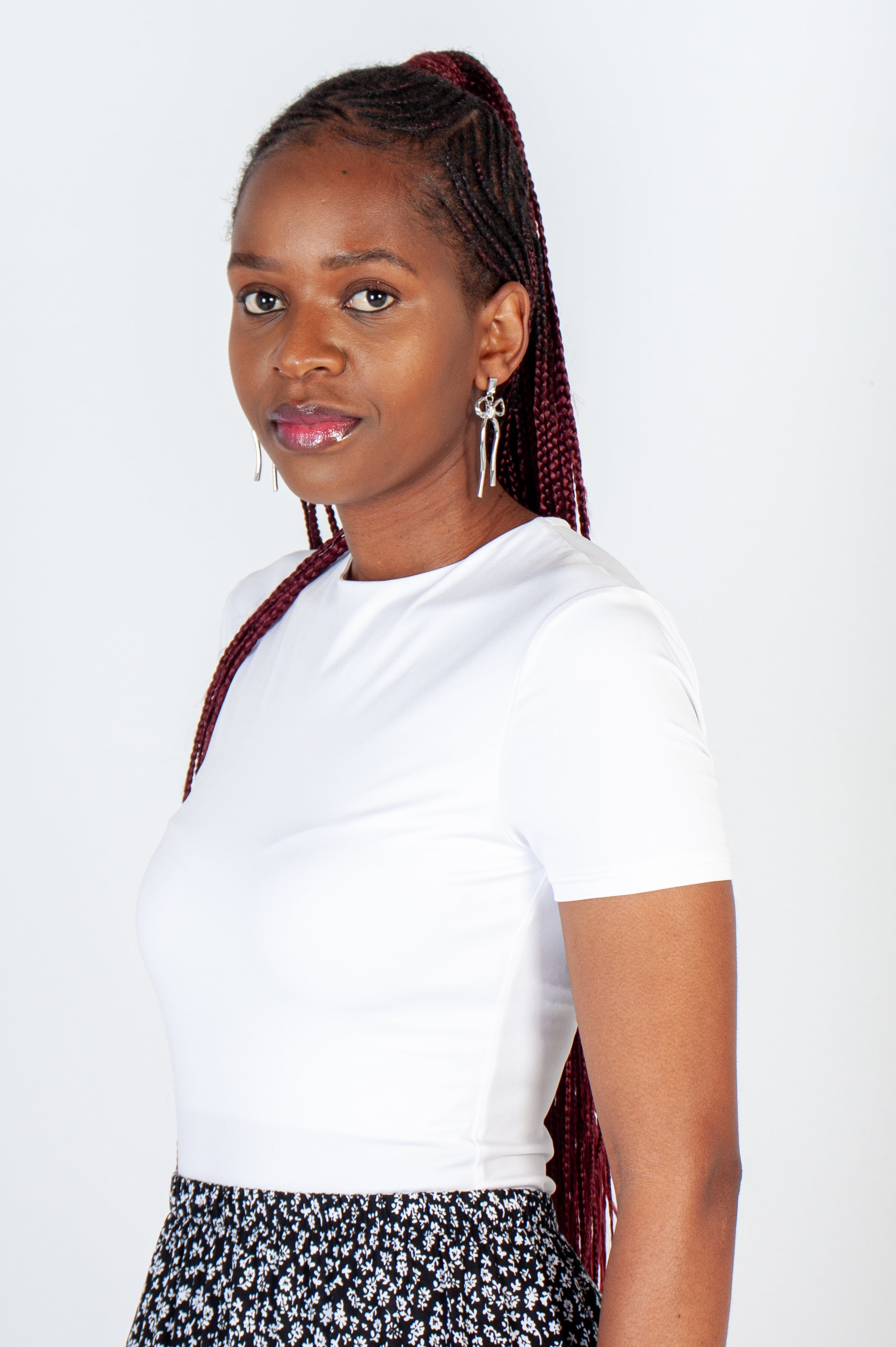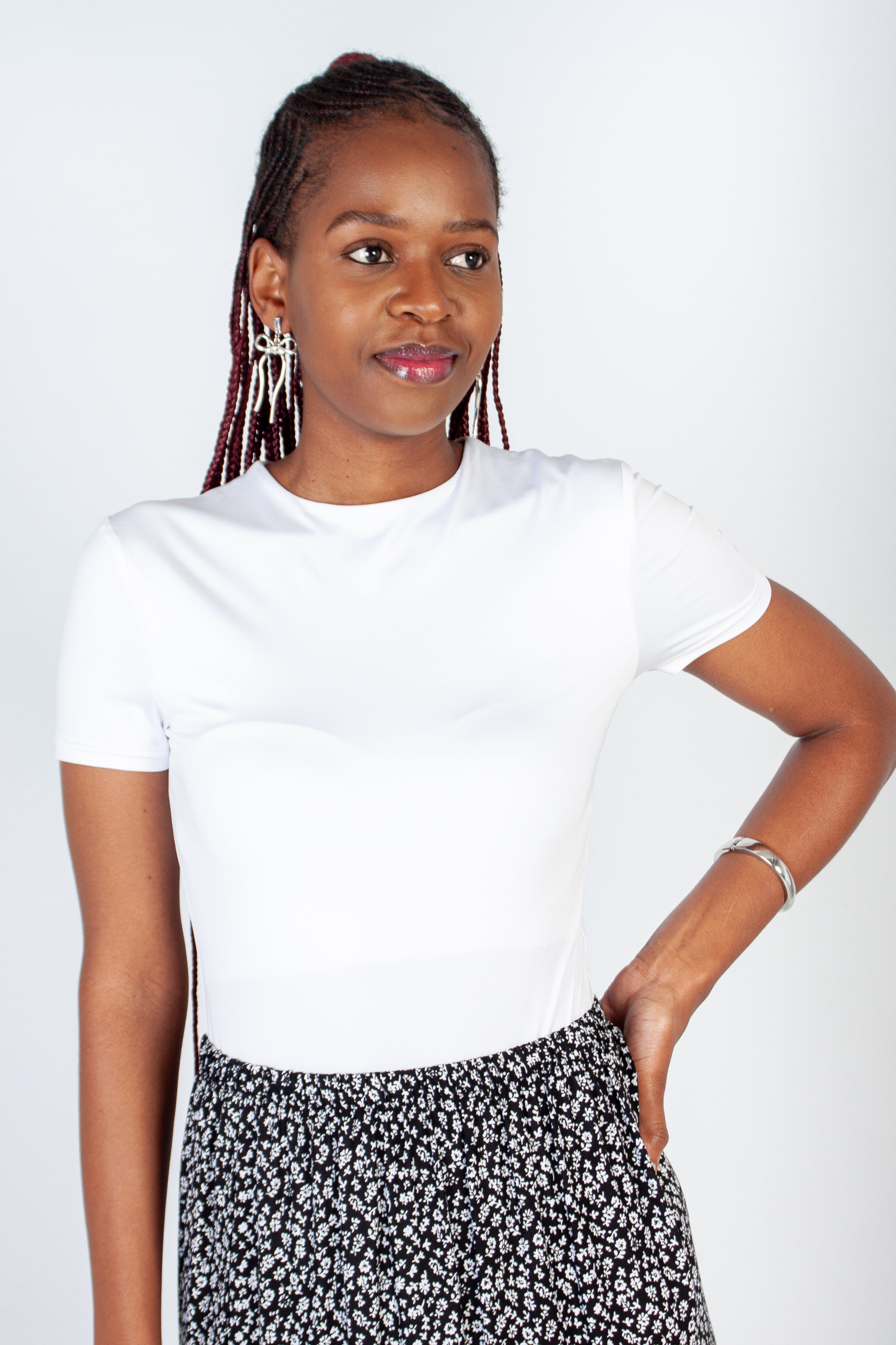 This bodysuit features a crew neckline. Short sleeves and fitted.