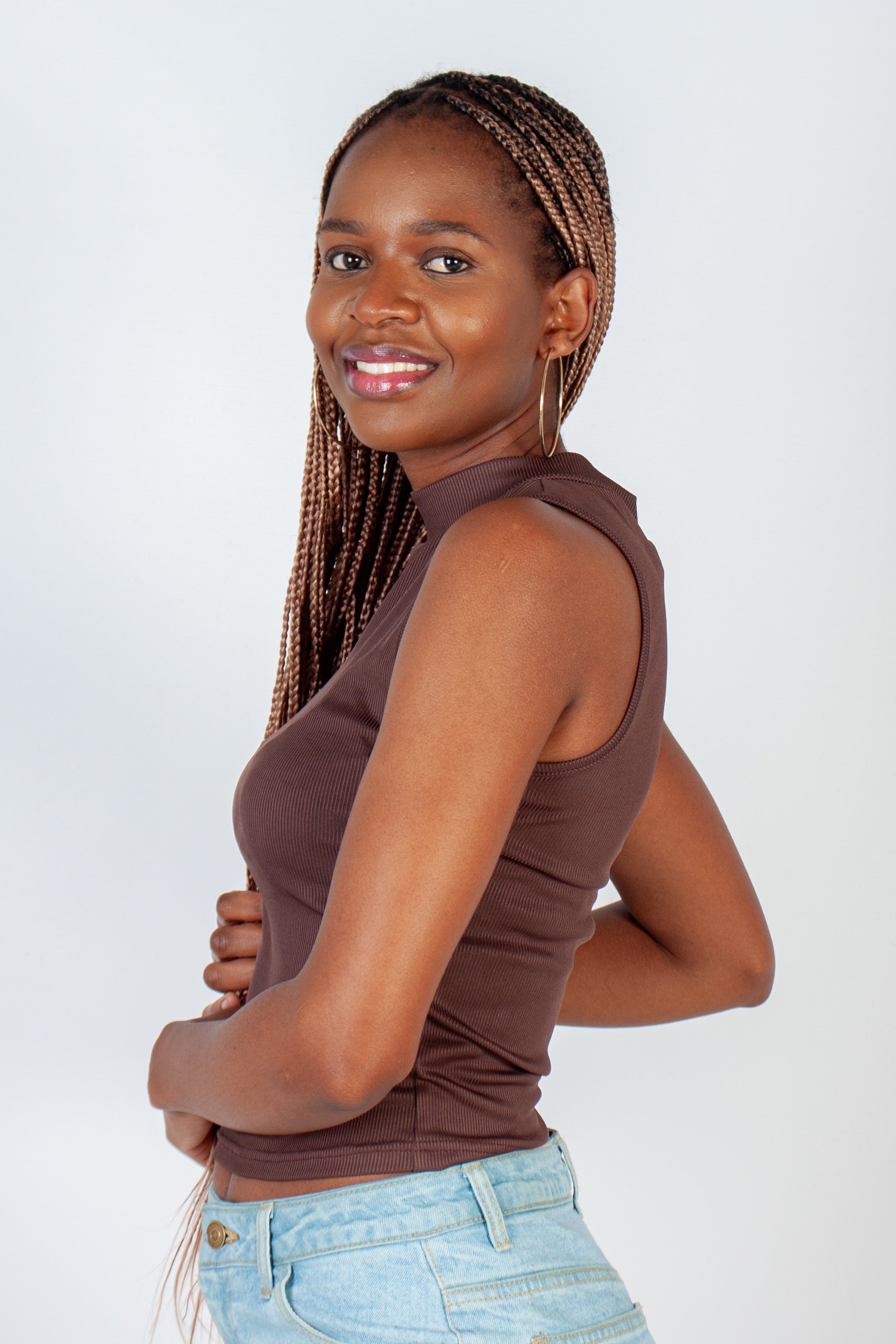 Sleeveless with a turtle neck-line. Fitted