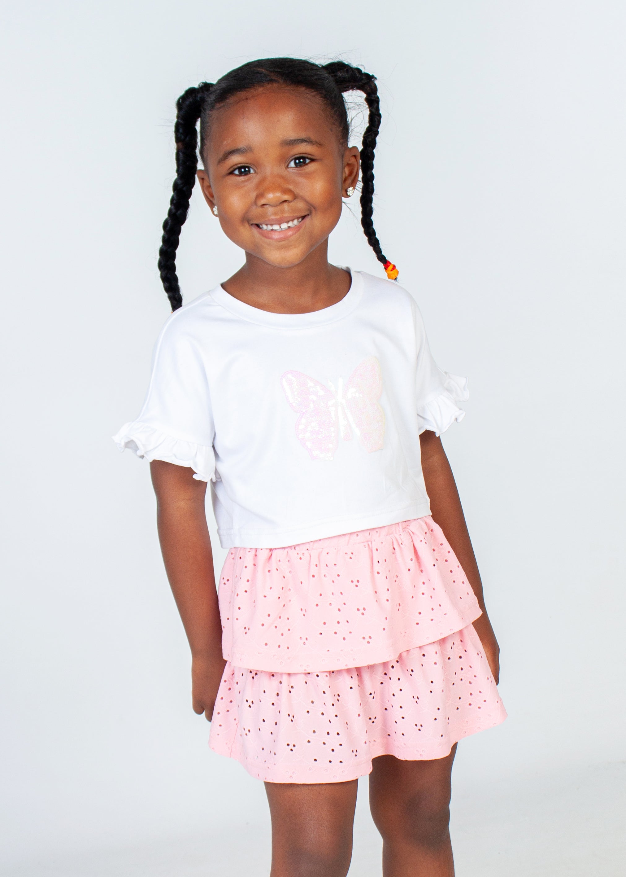 This set has a top with a crew neckline, short sleeves, graphic detail with a anglaise skirt.