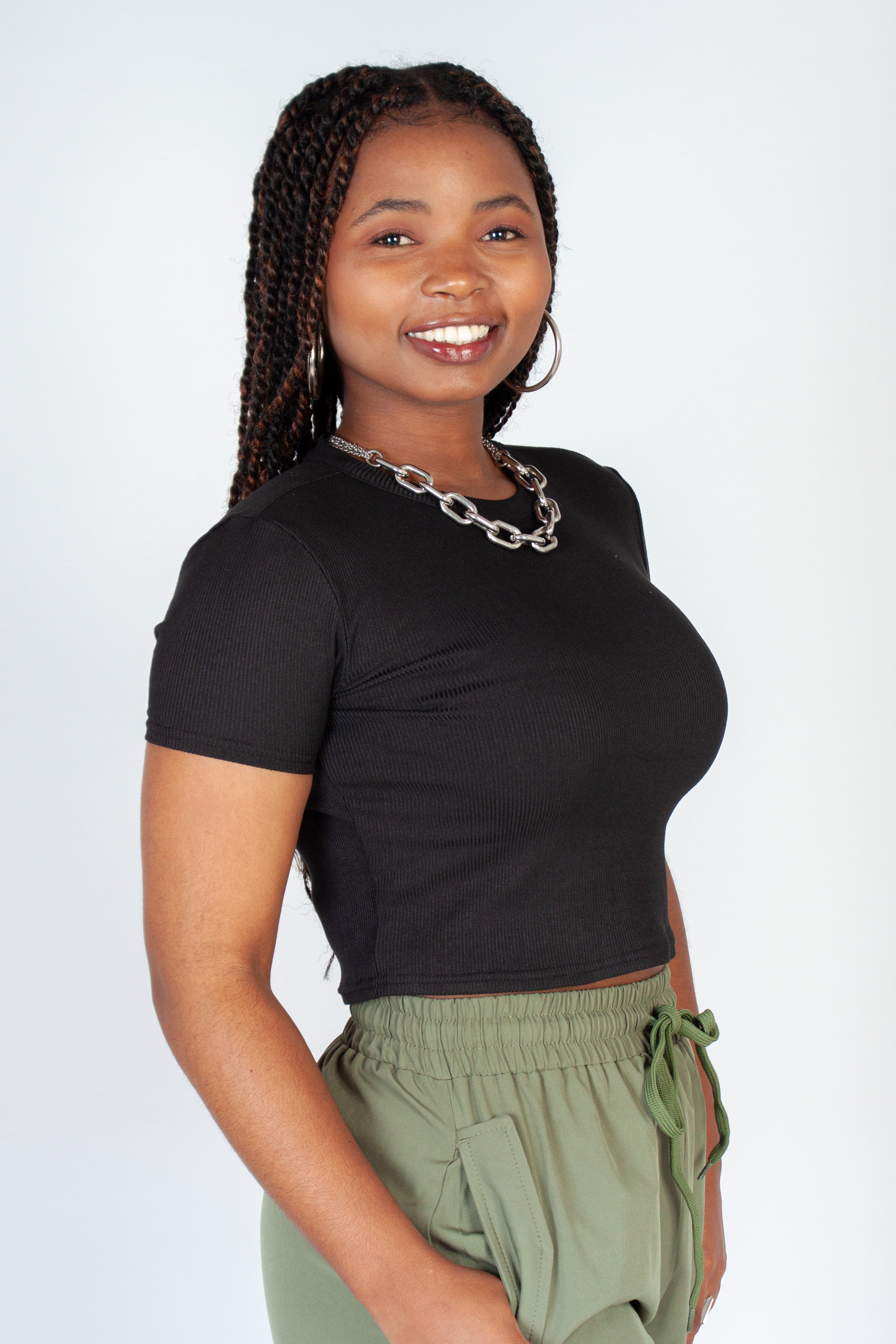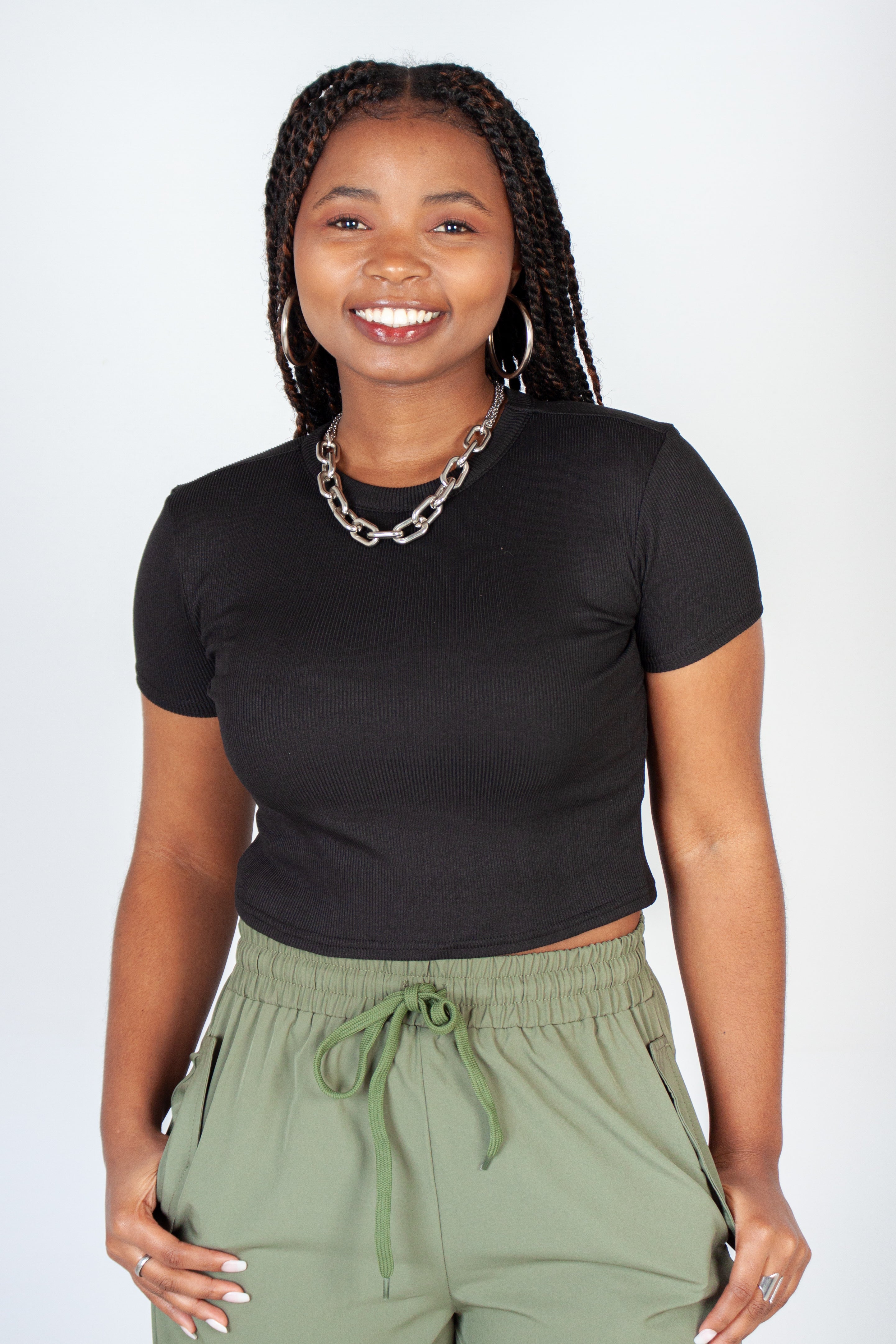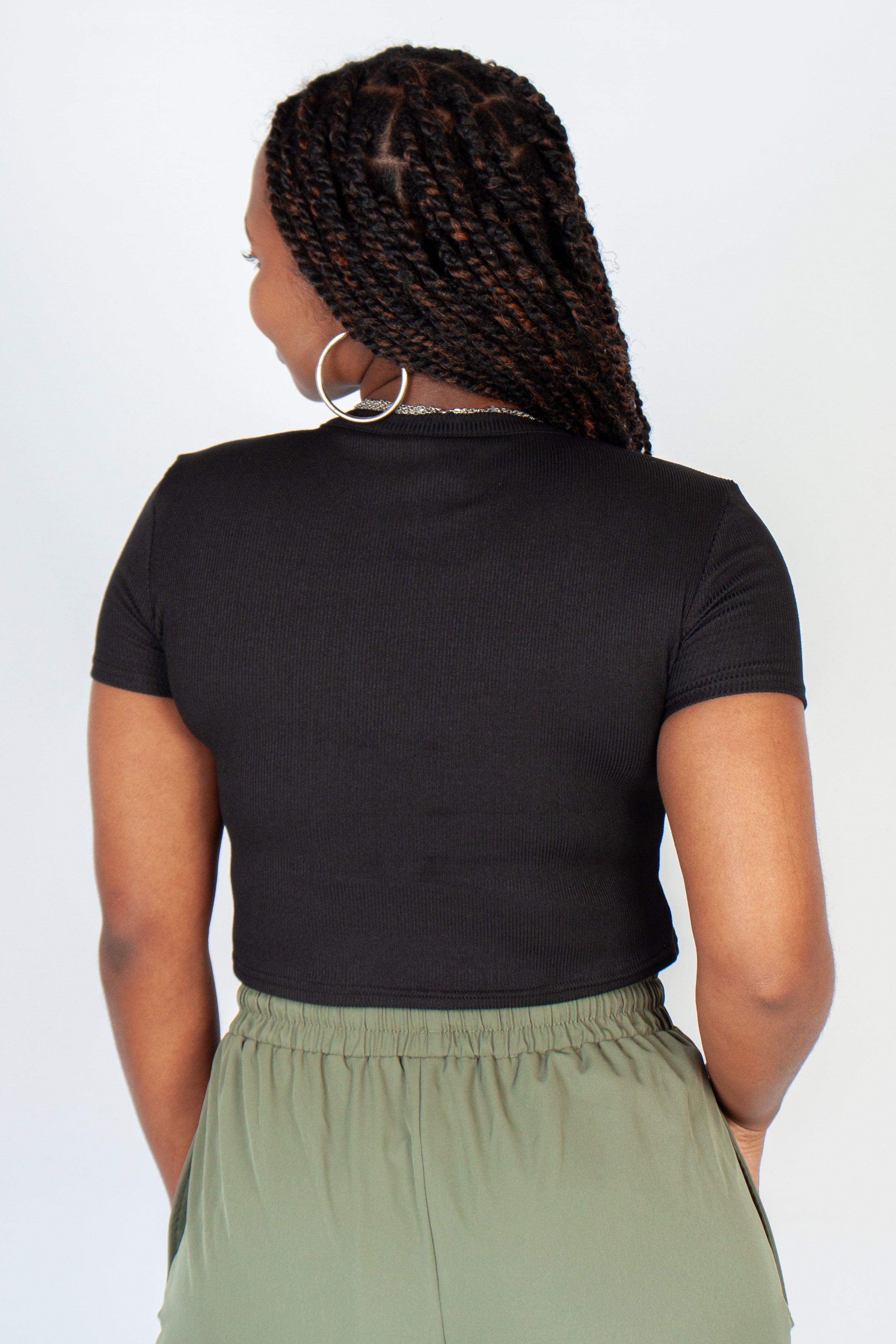 Perfect for an everyday wear! This easy-to-style cropped ribbed t-shirt has a crew neckline and short sleeves.