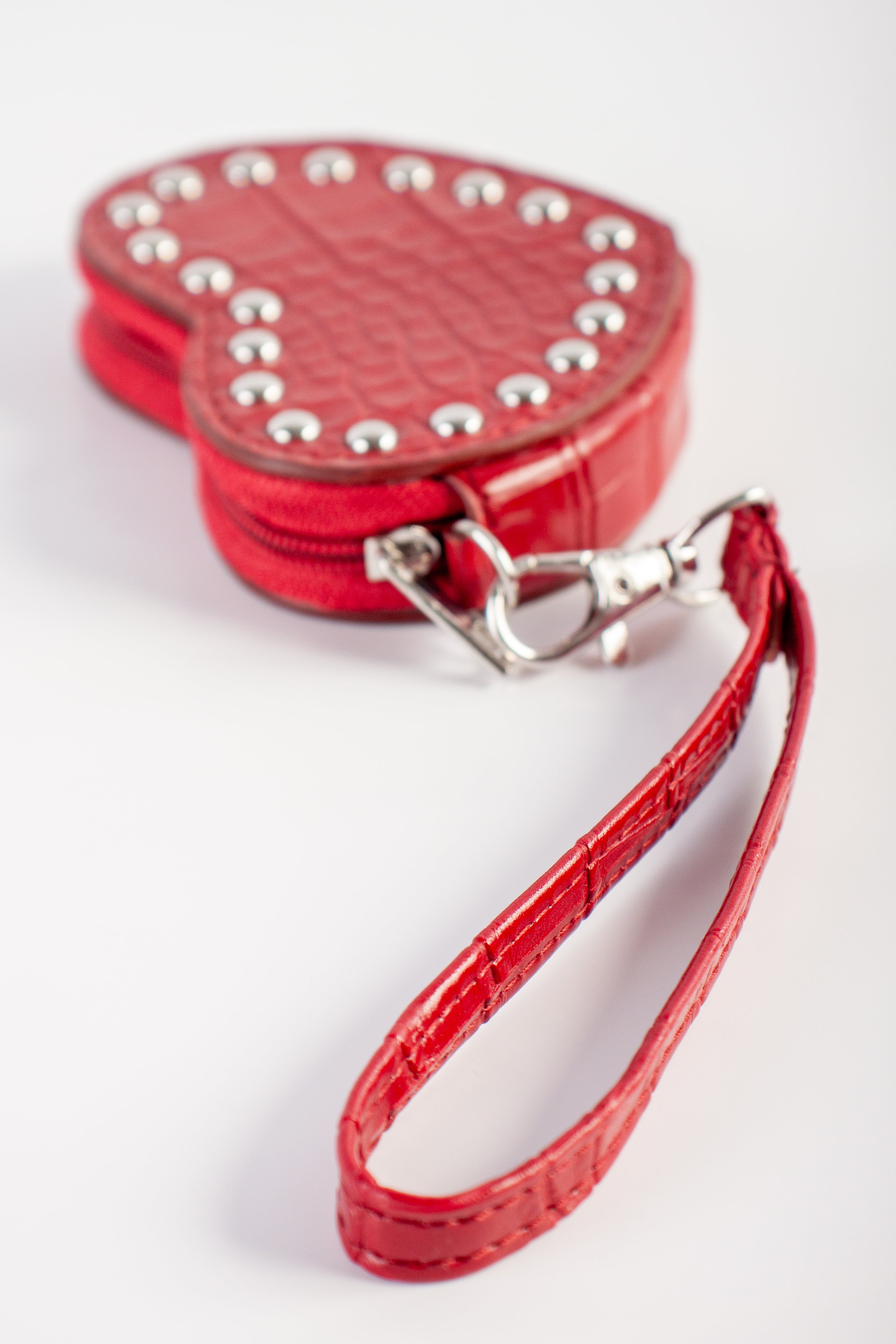Keep it neat, tidy, and trendy with this mini wallet. This heart shaped wallet has a zip-around closure with a coin compartment.
